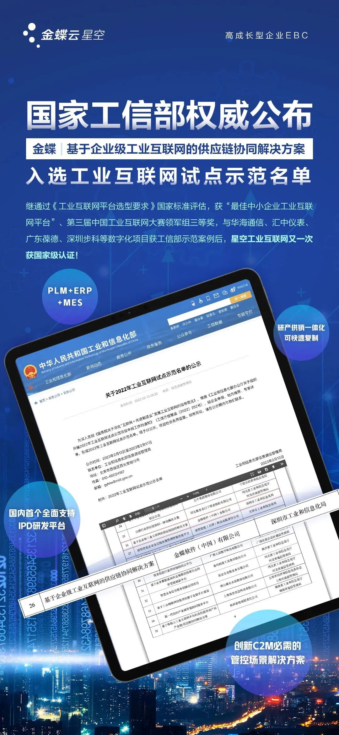 近日,工業和信息化部信息通信管理局發布關于2022年工業互聯網試點示范名單,金蝶軟件(中國)有限公司(簡稱“金蝶”)基于企業級工業互聯網的供應鏈協同解決方案(簡稱“金蝶供應鏈協同解決方案”)成功入選,成為工業互聯網平臺+產業鏈/供應鏈協同試點示范。