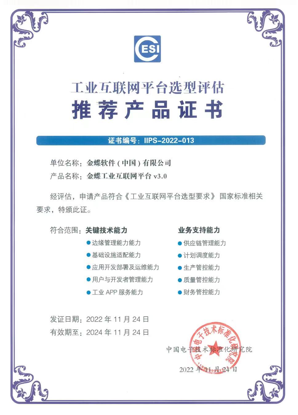 近日,中國電子技術標準化研究院(下稱“電子標準院”)發布了通過首批國家標準《工業互聯網平臺選型要求》的十四家平臺,金蝶工業互聯網平臺成功通過國家標準評選,成為“工業互聯網平臺選型評估推薦產品”。