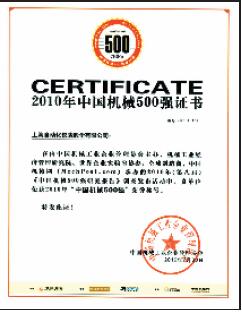 上自儀公司榮獲2010年”中國(guó)機(jī)械500強(qiáng)”榮譽(yù)稱號(hào)