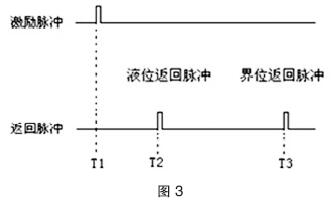 在傳感器檢測(cè)電路得到的信號(hào)中,除了激勵(lì)脈沖與液位感應(yīng)脈沖外,又增加了一個(gè)界面位置感應(yīng)脈沖,如圖3所示。通過(guò)測(cè)量界位感應(yīng)脈沖與激勵(lì)脈沖的時(shí)間差,就可計(jì)算出相界面位置兩種液體相界面的位置。
